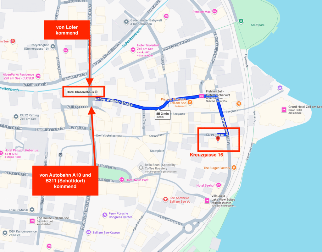 - Ein fixer Parkplatz befindet sich im Parkhaus Contipark Zentrum, Saalfeldner Straße 2, 5700 Zell am See