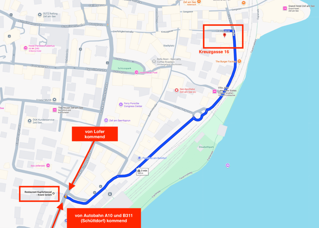 Anreise über Restaurant Kupferkessel und Bahnhof Zell am See
